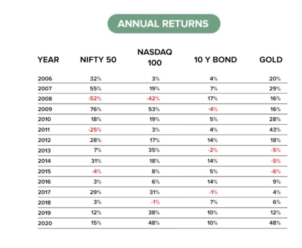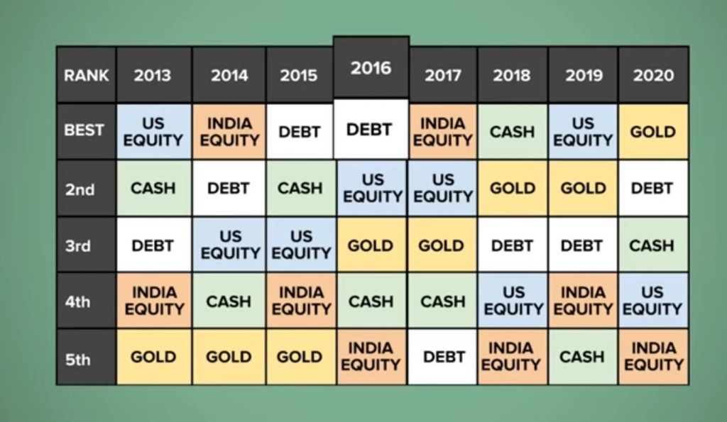 You can observe that there are some years in which domestic equity performed badly or in some years outperformed the NASDAQ too and in some period bond outperform the rest of the asset class (the year 2008).